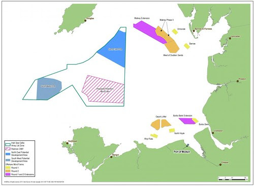 The sea off the North Wales Coast is becoming home to an increasing number of wind turbines. The North Hoyle and Rhyl Flats wind farms are clearly visible from the train.